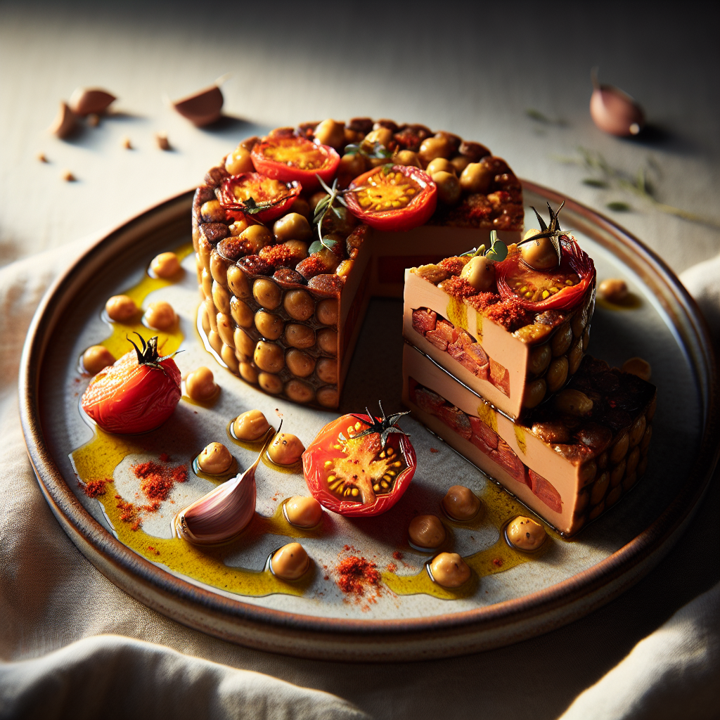 A luxurious terrine showcasing layers of umami-rich chickpeas and confit garlic tomatoes, elegantly complemented by a fragrant smoked paprika oil for a sublime balance of flavors and textures.