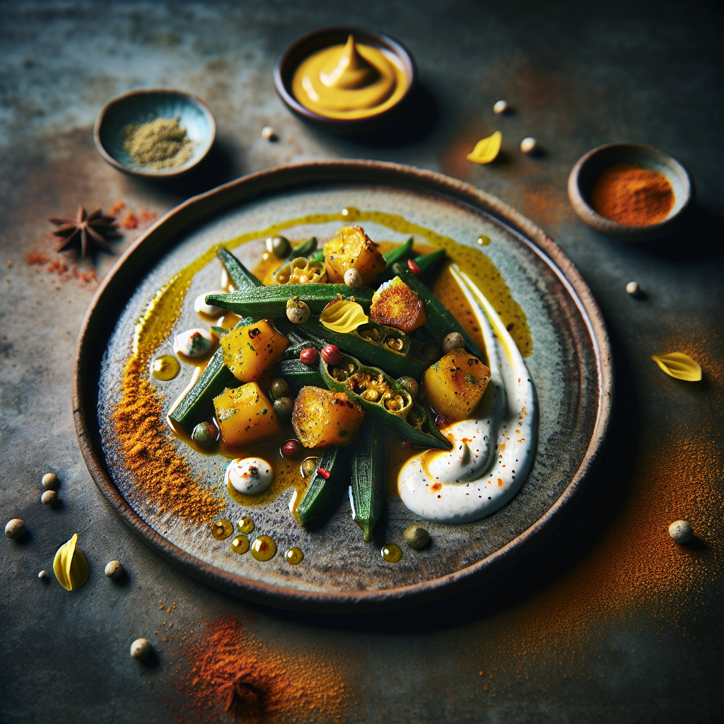 An exquisite interplay of textures and Mughlai spices, featuring the earthiness of okra and potatoes, elevated with mustard oil, served alongside a delicate saffron yogurt emulsion to provide a luxurious creamy contrast.