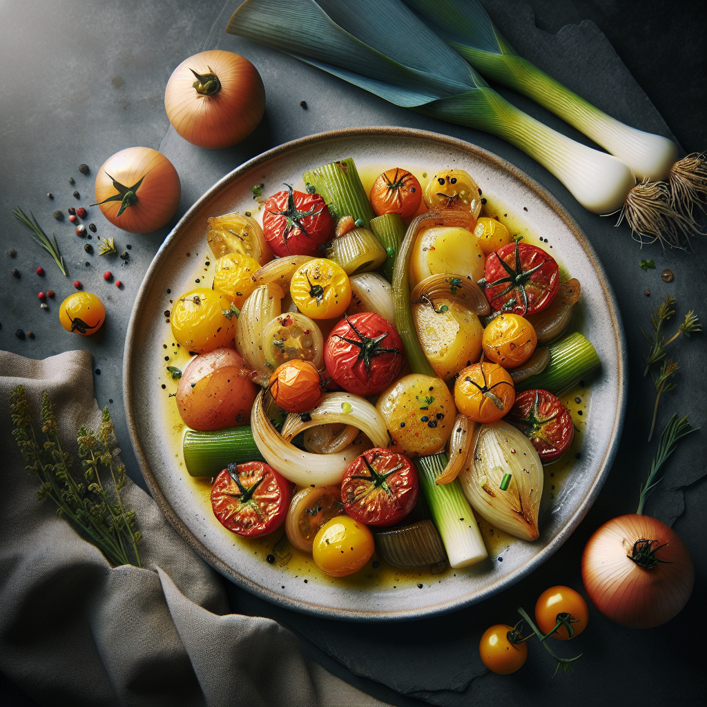 A refined, slow-braised preparation utilizing the natural sweetness of caramelized leeks and onions, coupled with tender potatoes and bursting heirloom tomatoes, simmered gently in white wine and herbs.