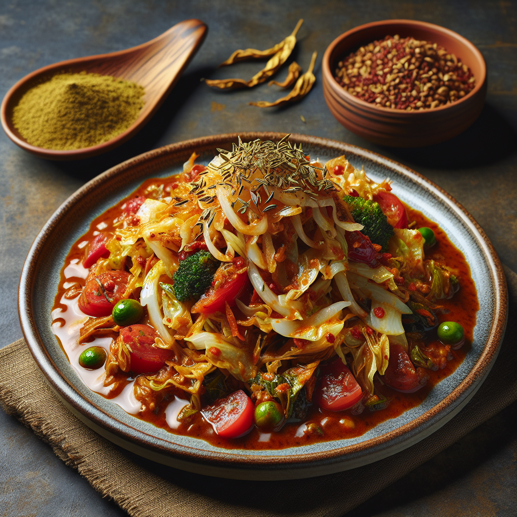 An elevated, aromatic preparation of finely shredded cabbage simmered in a rich, Mughlai-inspired gravy of slow-caramelized onions, vine-ripened tomatoes, and layered whole spices, finished with a whisper of dried fenugreek.