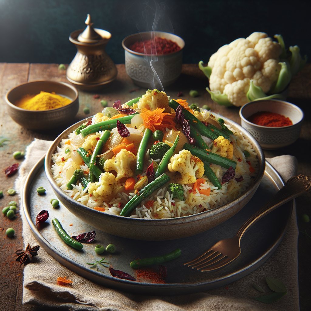 A refined, Mughlai-style rice preparation where fragrant basmati is layered with delicately spiced cauliflower, crisp green beans, caramelized onions, and toasted whole spices, finished with saffron and ghee.